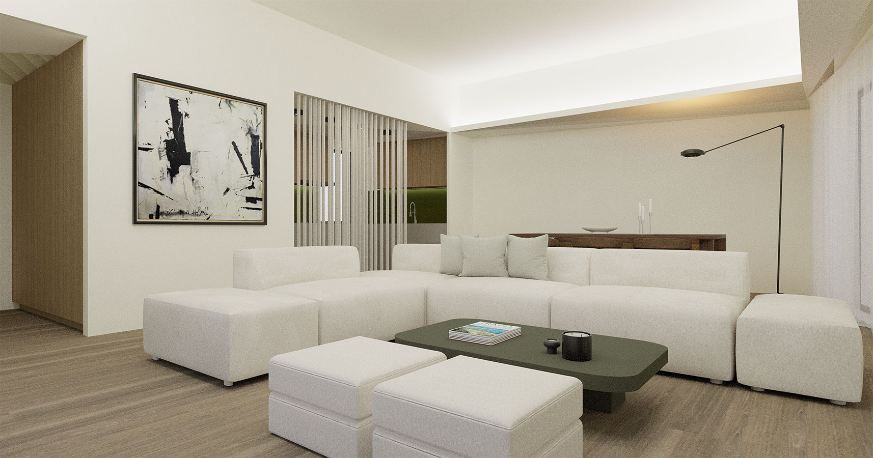 Spaces with perspective, materials from wall to wall, lighting effect to complete, not to interrupt, colors to flow over, not to be against, furniture to combine with the construc-tion, forms to distinguish not to break apart.