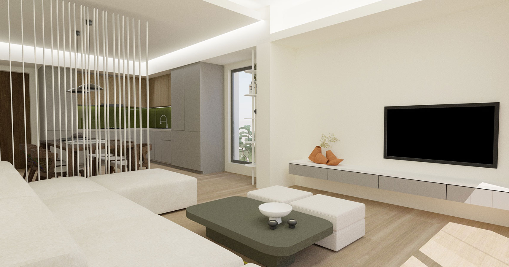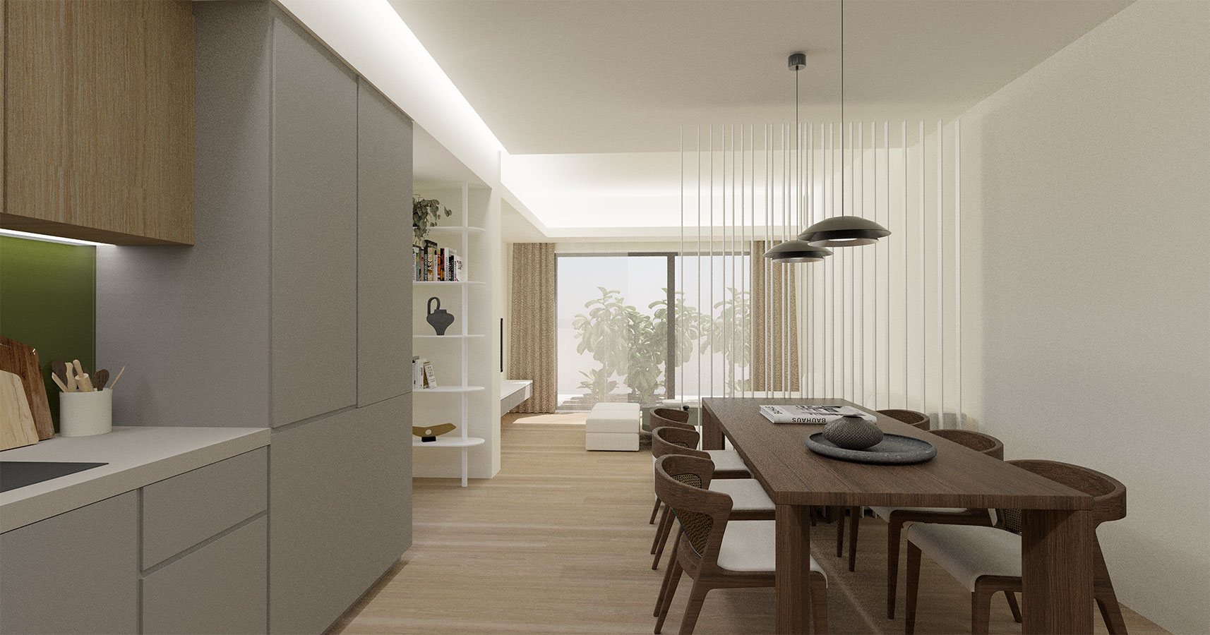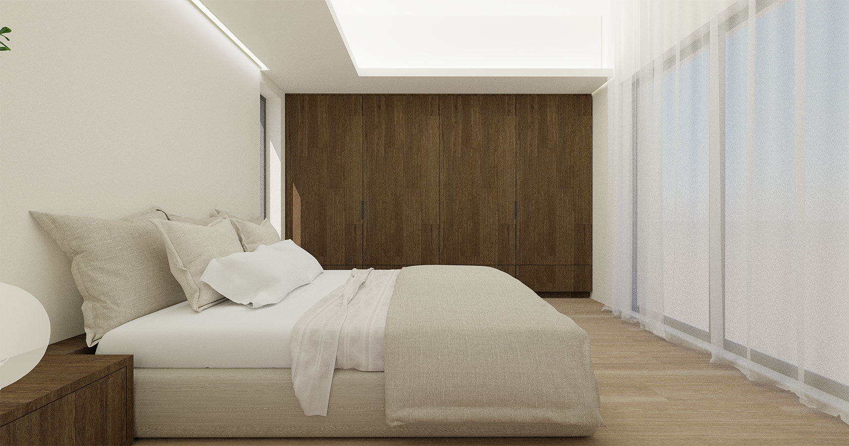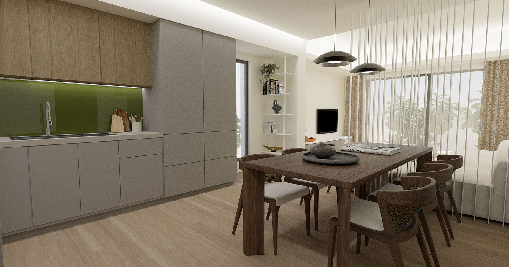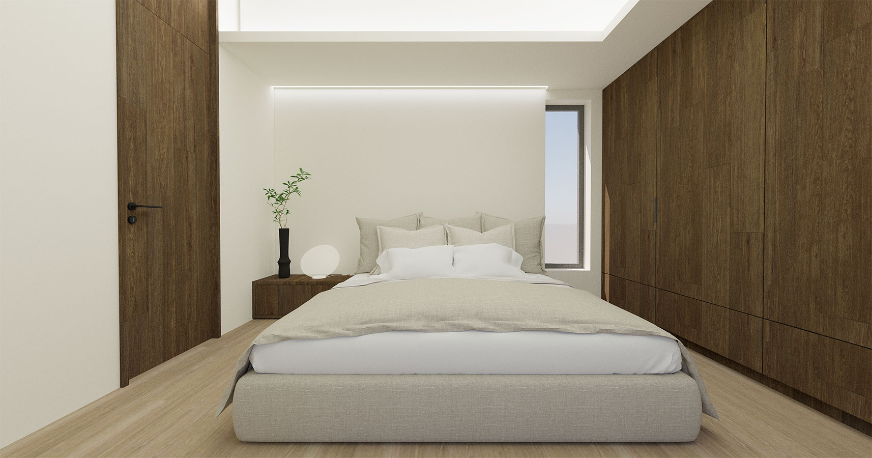 The result refers to a 28-apartment building, leading the basic façade design to be created through cells for controlled views towards the sky and not the constructed environment. Planting has been added in certain places to create a “green neighbor-hood”. The existence of some two-floor height veranda openings enhances the result and make a very lively compound. Wooden look shading panels that may roll aside according to the user’s need, complete the façade in a delicate form giving an attract-ing final look. Verandas are fully compatible with the interiors giving the most suitable functionality & accessibility.